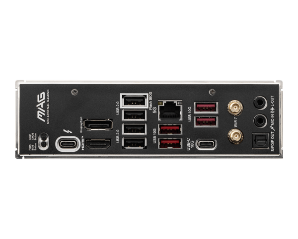 BACK PANEL PORTS: : Clear CMOS Button: DisplayPort: USB 2.0 (Flash BIOS Port): 5G LAN: USB 10Gbps Type-A: Audio Connectors: Flash BIOS Button: Thunderbolt(TM) 4 40Gbps (Type-C): HDMI(TM): USB 2.0: USB 10Gbps Type-A: USB 10Gbps Type-C: Wi-Fi / Bluetooth: S/PDIF-OUT: OPERATING SYSTEM: Support for Windows(R) 11 64-bit